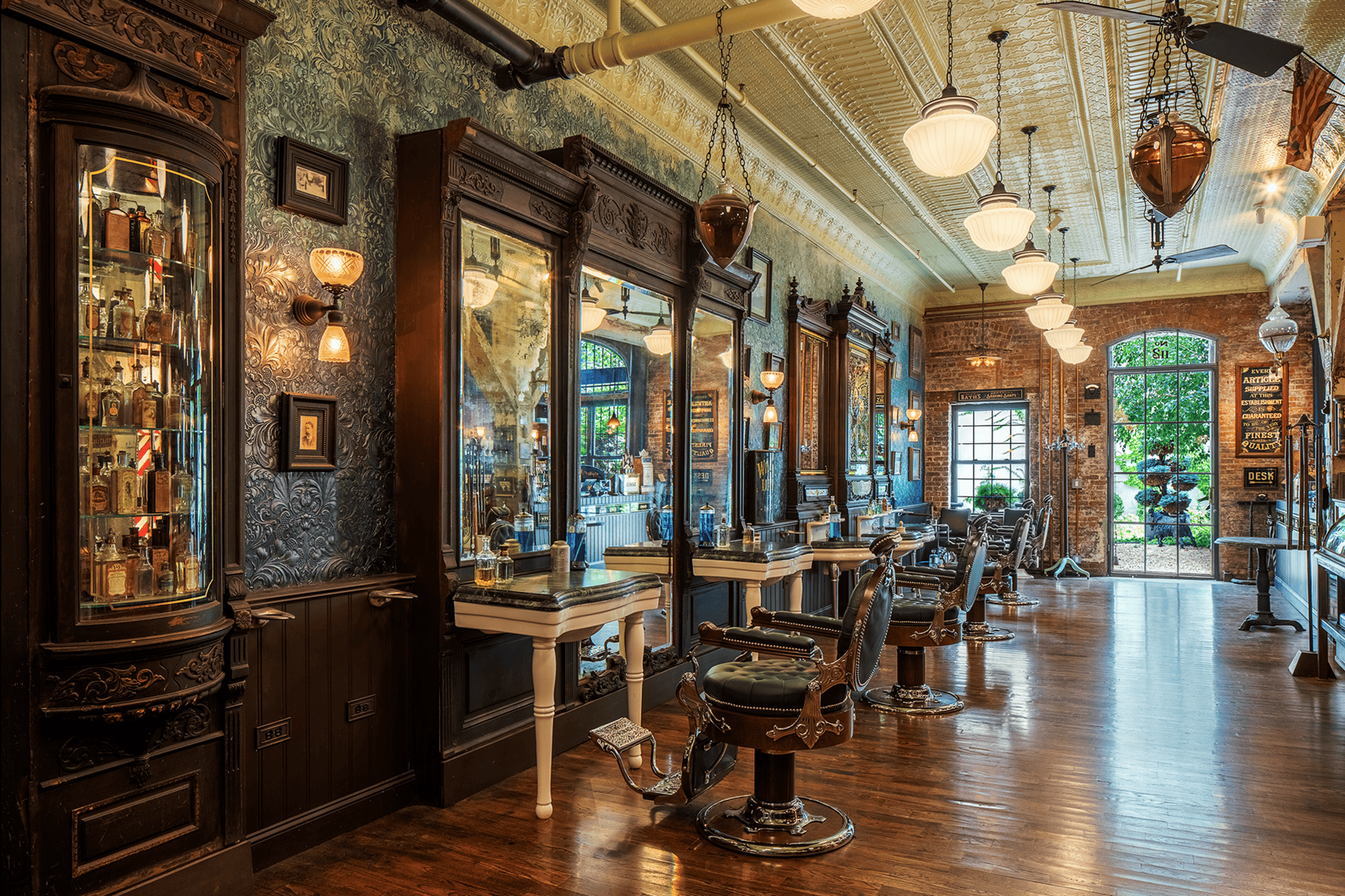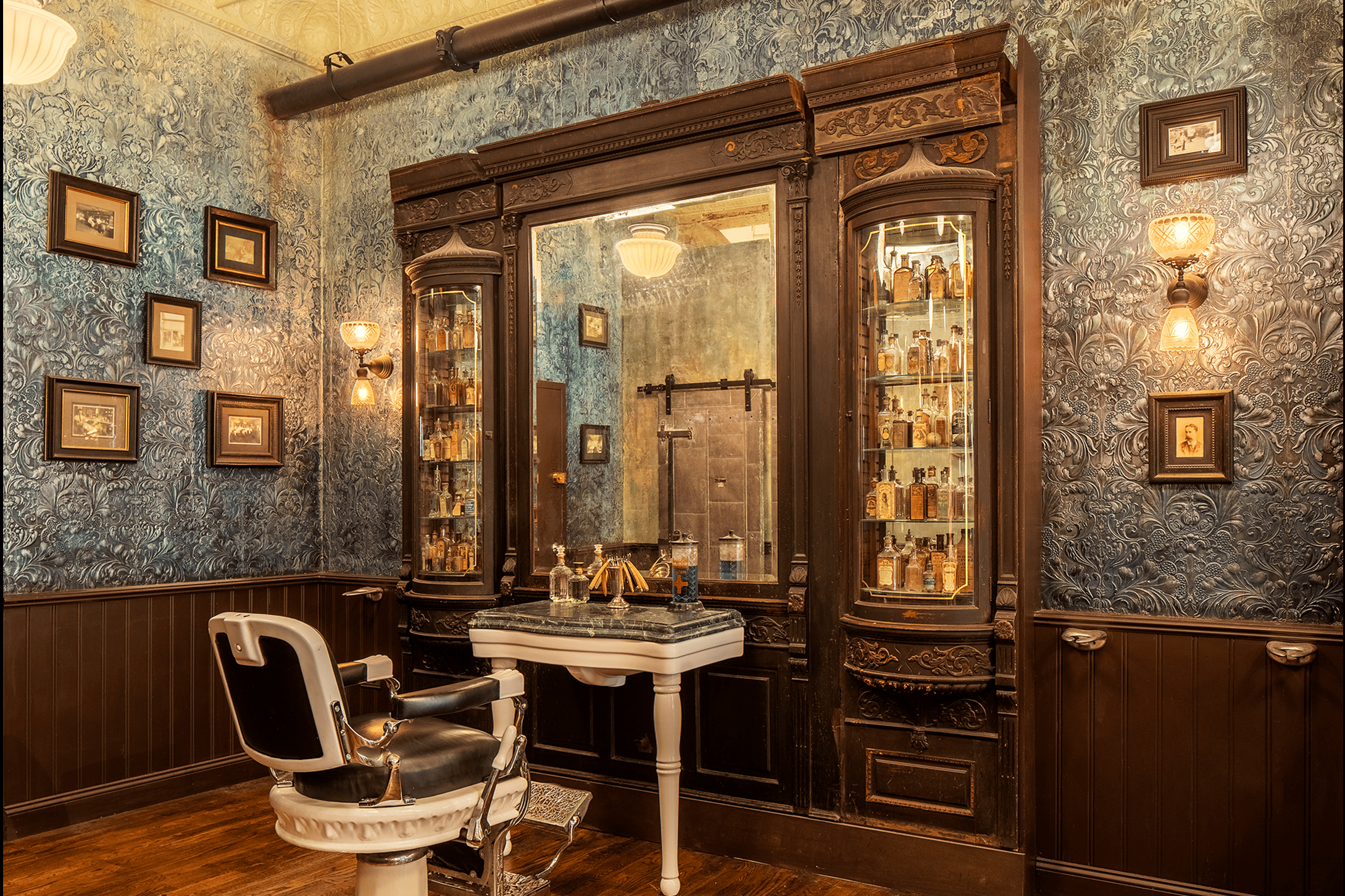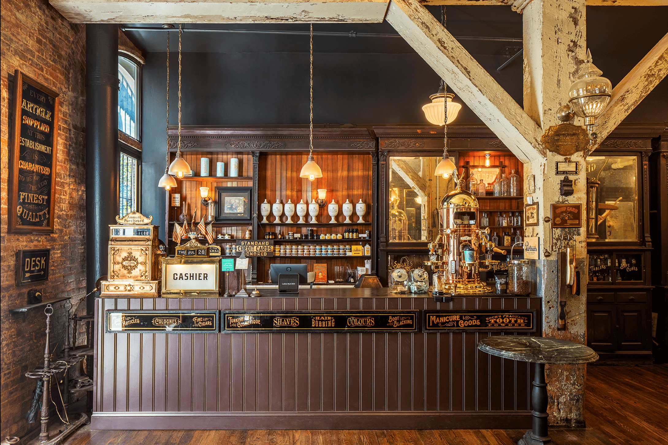 Ludlow Blunt’s interior offers a rare blend of historic character and refined detail—authentic 1885 Cuban mahogany pharmacy cabinets, original 1880s barber chairs, and period lighting throughout.