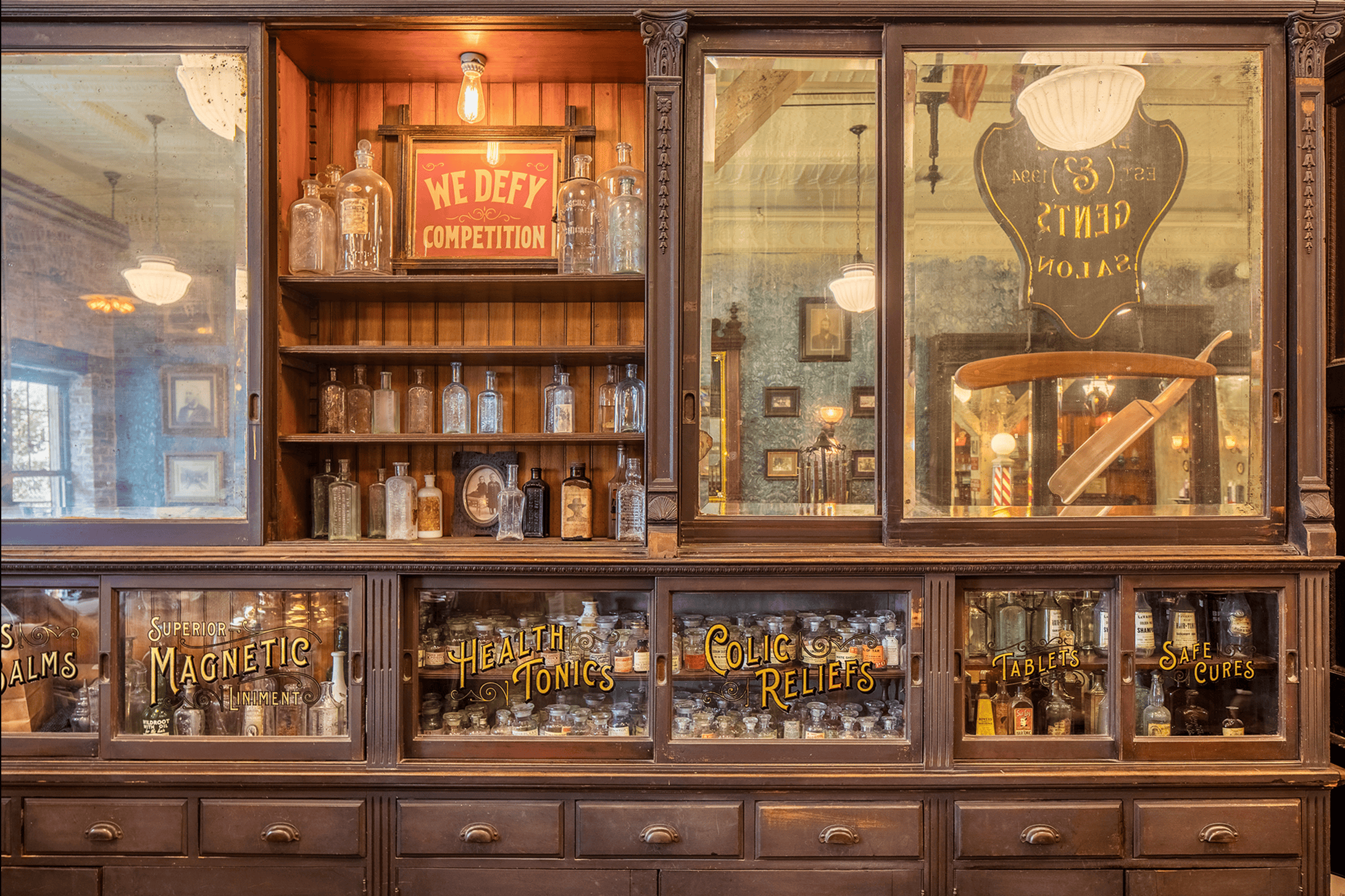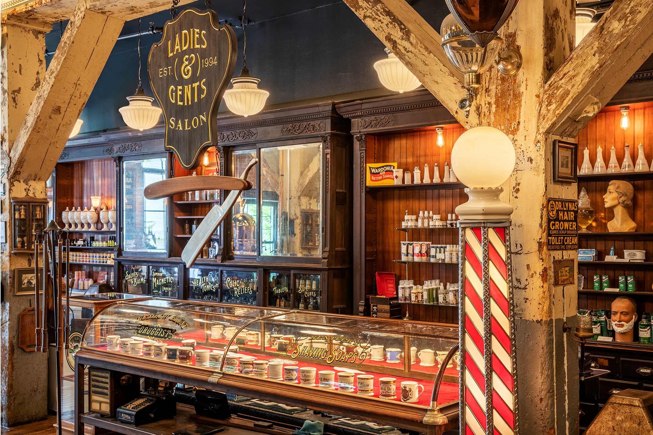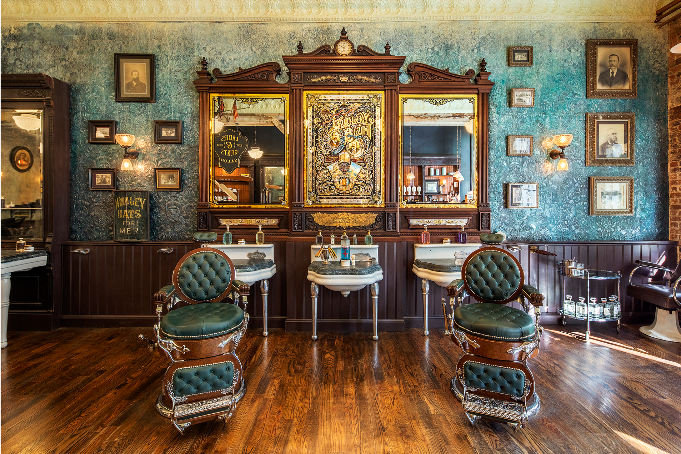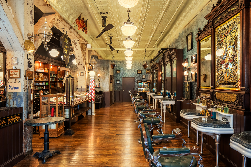 Ludlow Blunt’s interior offers a rare blend of historic character and refined detail—authentic 1885 Cuban mahogany pharmacy cabinets, original 1880s barber chairs, and period lighting throughout.